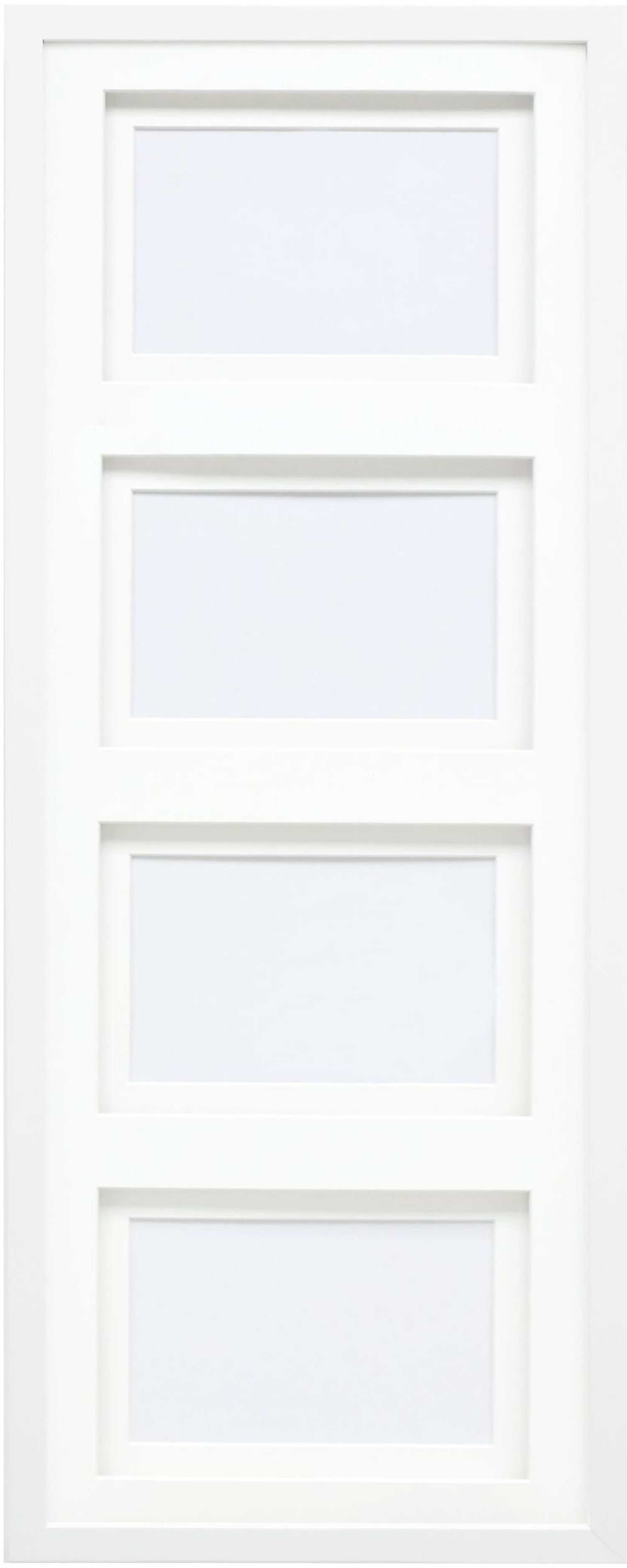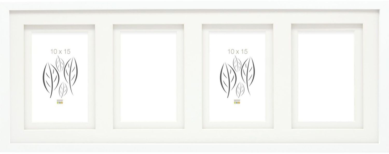 Moderner Holz-Galerierahmen in Weiß für 4 Fotos (10x15 cm) mit doppelt Passepartout und Klarglas. Ideal für Familienfotos, Urlaubsbilder oder als stilvolles Geschenk. Hoch- und Querformat montagefähig.