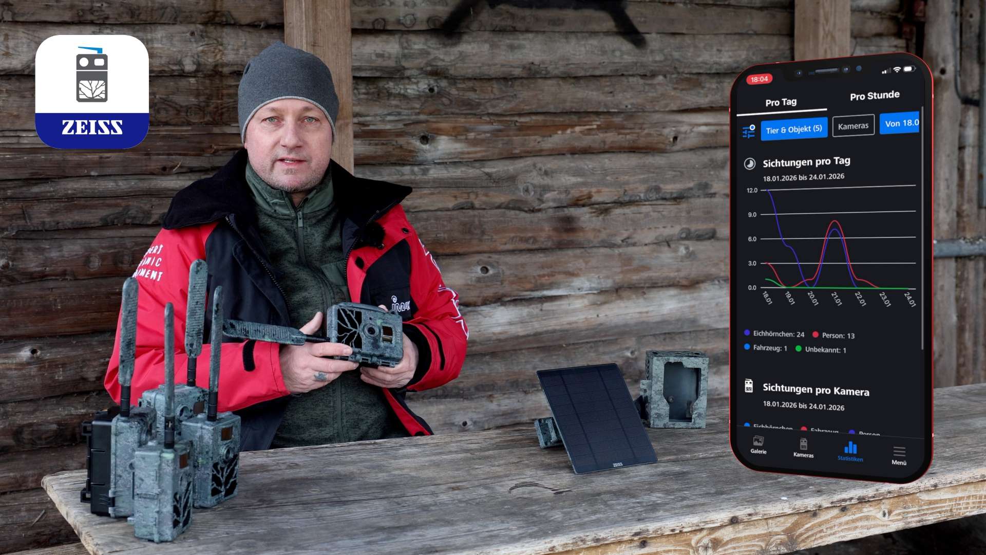 Die ZEISS Secacam 1 kombiniert bewährte ZEISS Bildqualität mit modernster Konnektivität und höchster Benutzerfreundlichkeit. Mit 60 Black-LEDs und lichtempfindlichem Sensor entstehen gestochen scharfe Aufnahmen bei Tag und Nacht – dank IR-Boost-Technologie auch in völliger Dunkelheit. Produktbilder zeigen optionales Zubehör und Anwendungsbeispiele.