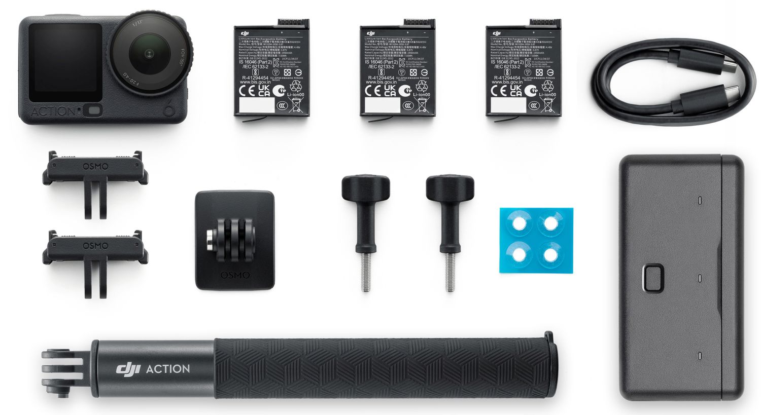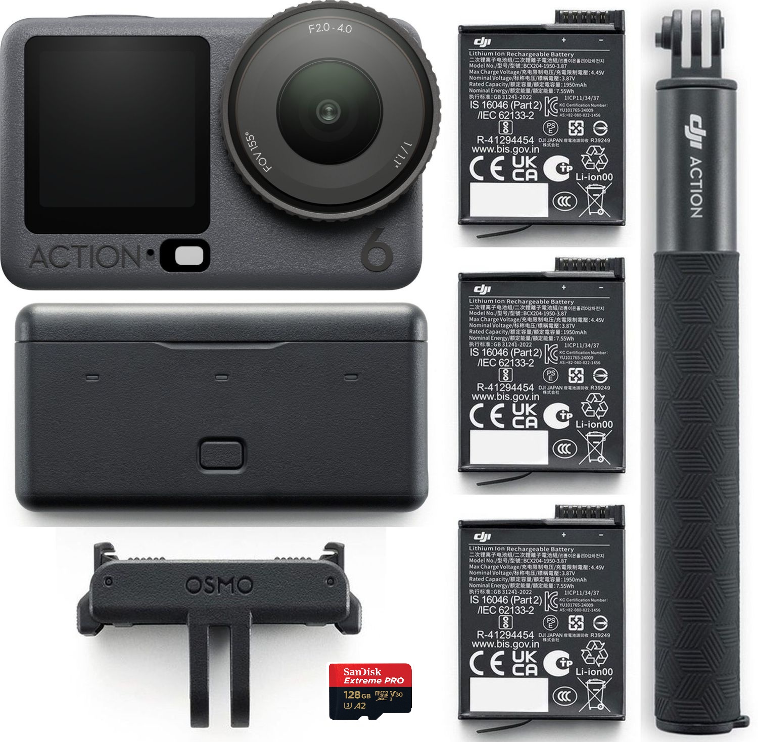 Die DJI Osmo Action 6 Adventure Combo enthält zusätzlich 2x Extreme Akku Plus (1950 mAh), 1x Dual-Direction Schnellverschluss-Adapterhalterung, 1x Ladeschale für bis zu drei Akkus sowie einen 1,5m Verlängerungsstab.