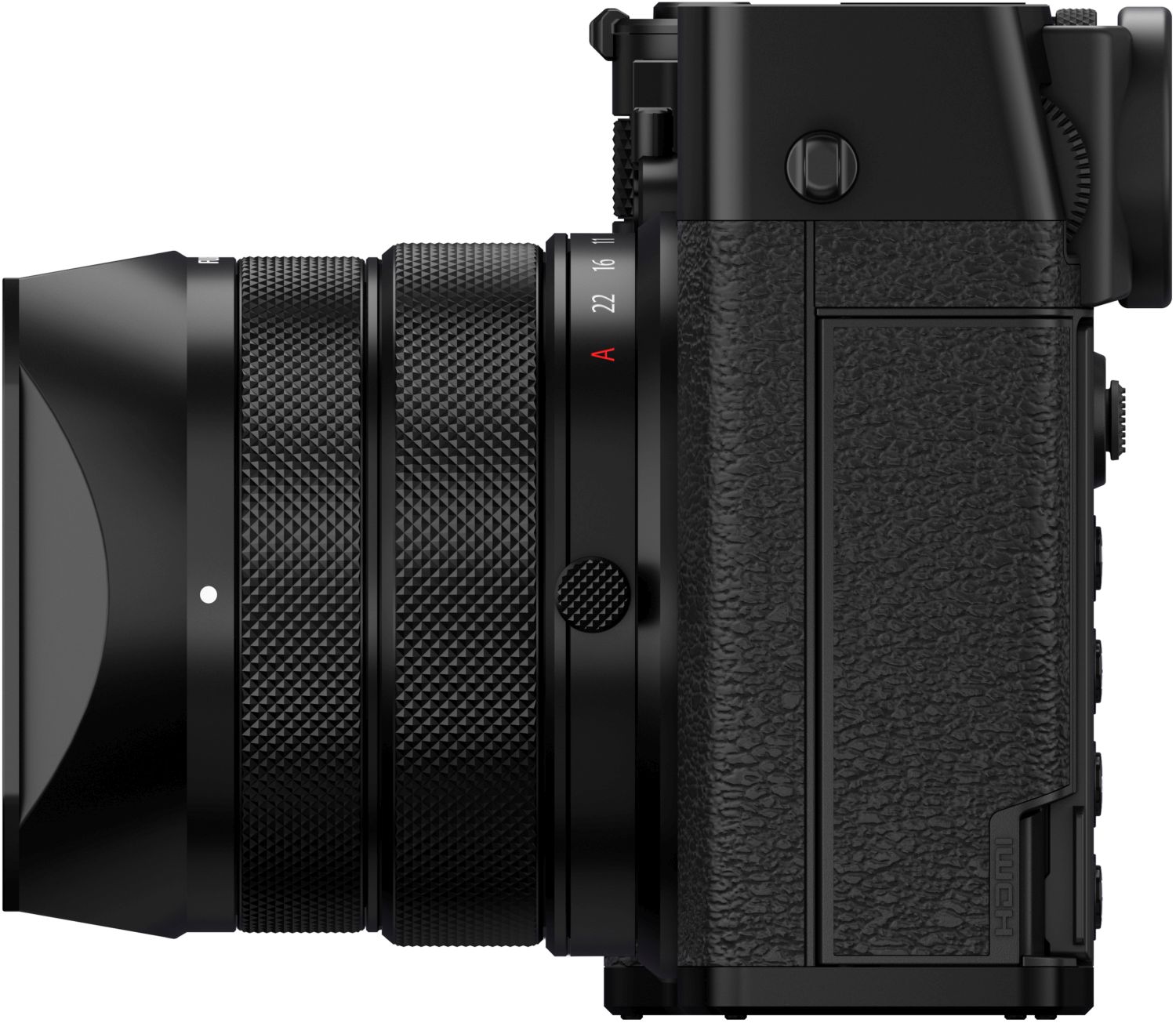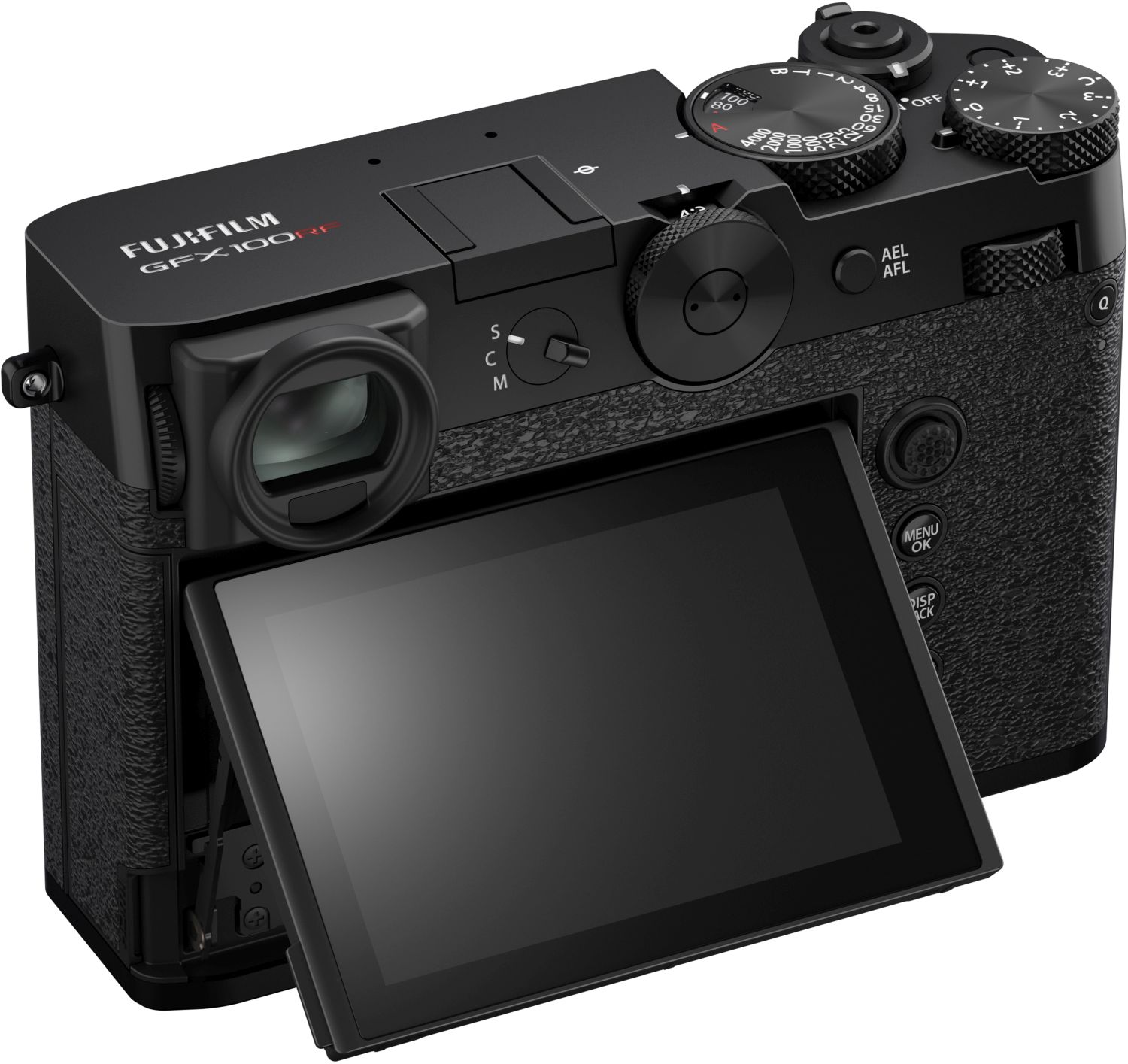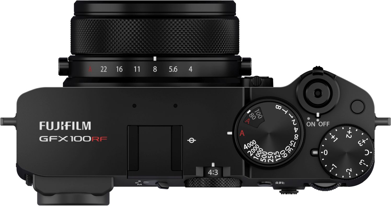 Die obere Gehäuseplatte der GFX100RF besteht aus präzisionsgefertigtem Aluminium. Auch der Objektivring, die Einstellräder, die Bodenplatte sowie weitere Details sind sorgfältig verarbeitet und sorgen für eine hochwertige Haptik und ein charakteristisches Design.