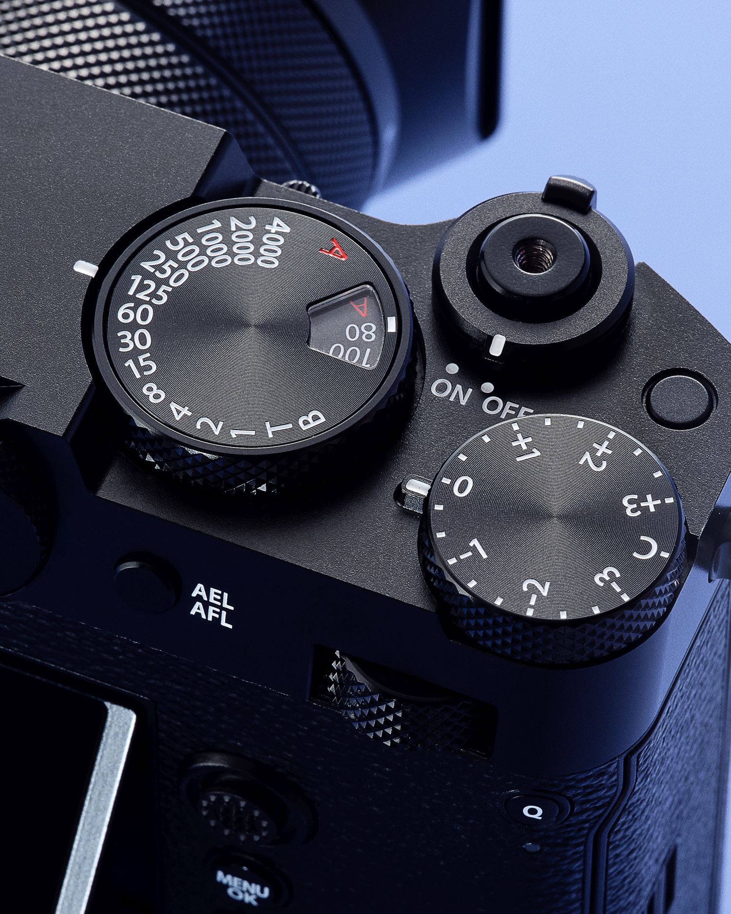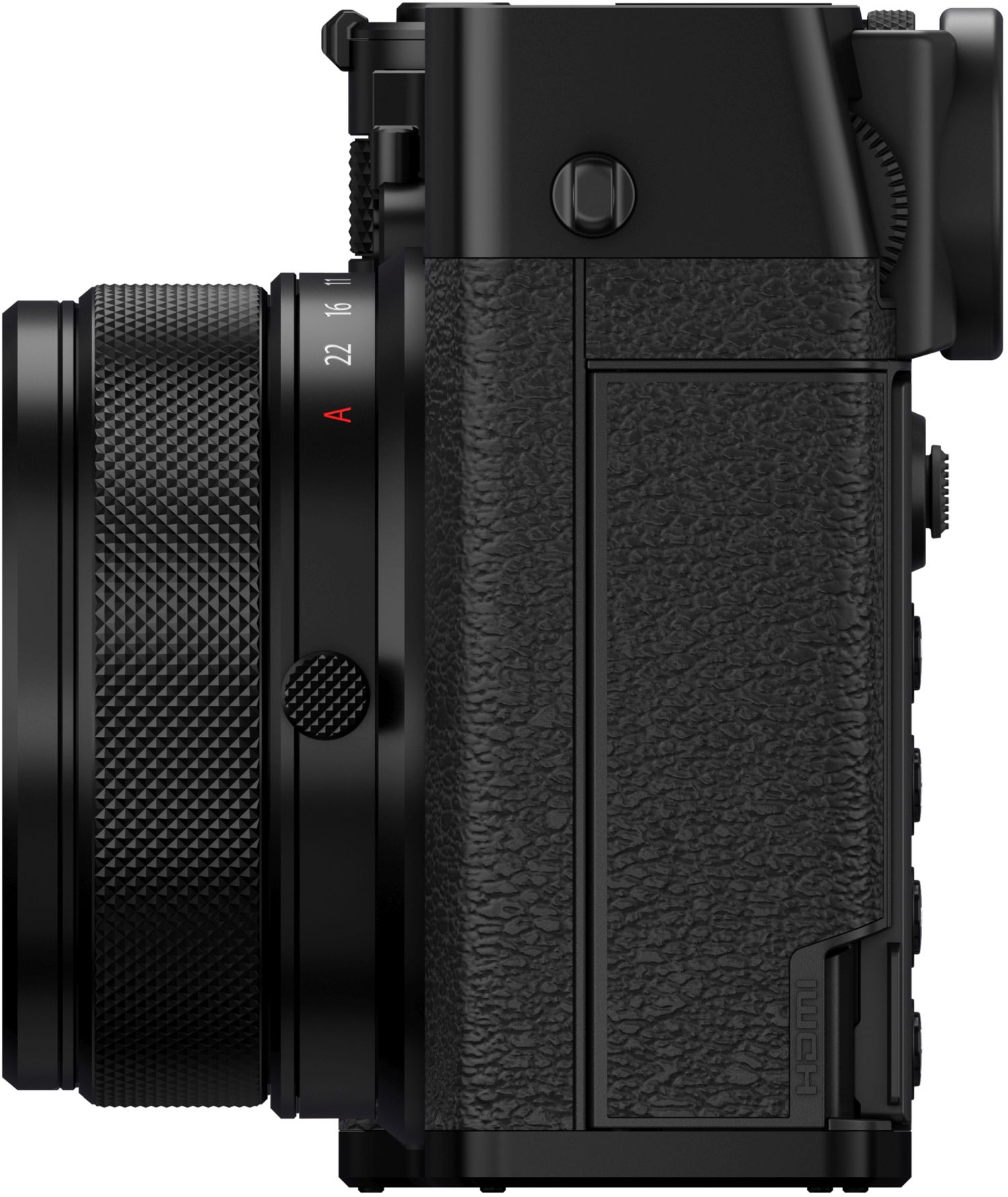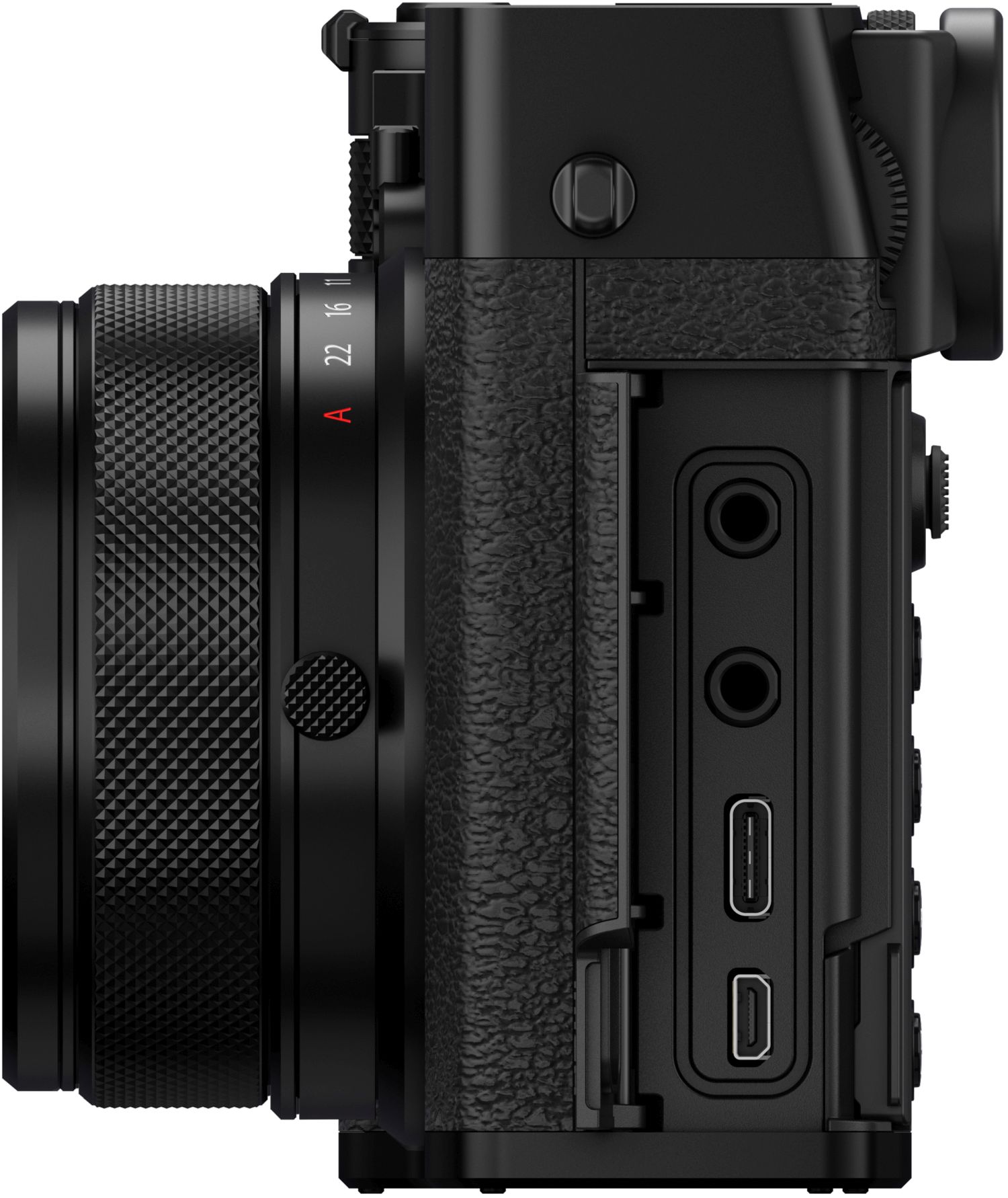 Die obere Gehäuseplatte der GFX100RF besteht aus präzisionsgefertigtem Aluminium. Auch der Objektivring, die Einstellräder, die Bodenplatte sowie weitere Details sind sorgfältig verarbeitet und sorgen für eine hochwertige Haptik und ein charakteristisches Design.