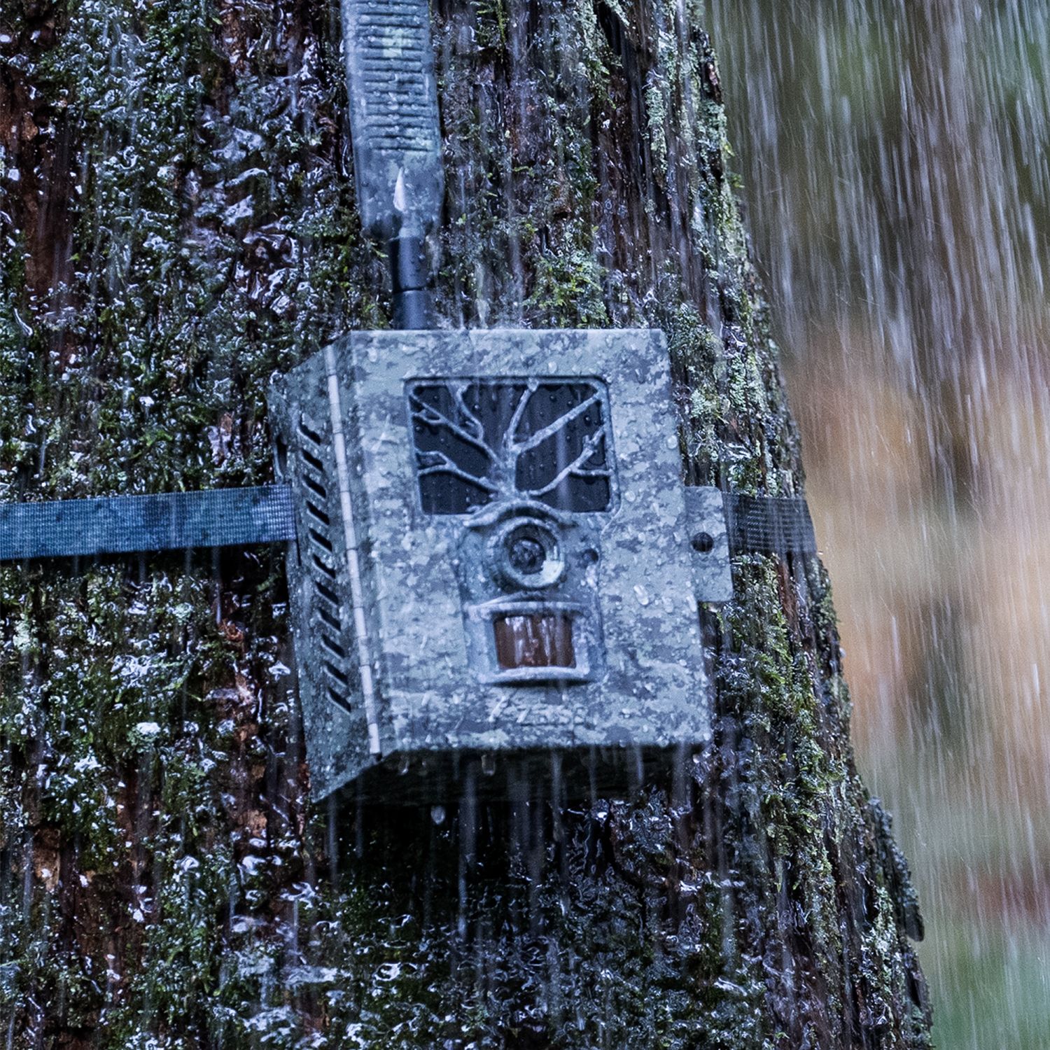 Das robuste Gehäuse umschließt die komplette Kamera. Passgenaue Aussparung an der Frontseite stellen sicher, dass die Funktionen der Kamera nicht beeinträchtigt werden. Das vollflächige Tarnmuster erleichtert das Verstecken der Kamera in natürlicher Umgebung.