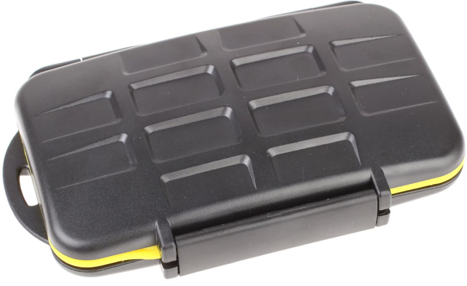 Das Etui hat im Unterteil und in der Deckelklappe je eine schockabsorbierende Gummieinlage mit passgenauen Aussparungen für jeweils drei Speicherkarten. Die Gummieinlagen und das Gehäuse aus stoßfestem Polykarbonat-Kunststoff schützen die Speicherkarten zuverlässig vor Stößen, während eine Gummidichtung verhindert, dass Schmutz oder Wasser in das Etui eindringen. Außerdem hat das Etui einen praktischen Schnappverschluss und eine Öse zum Anbringen einer Trageschlaufe.