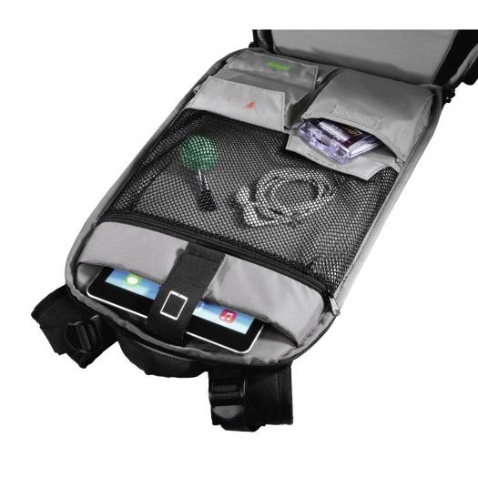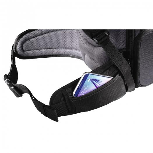 Mit den 13 variablen Inneneinteilern, die sich herausnehmen lassen, kann das Interieur auf die eingesetzte Ausrüstung ideal angepasst werden. Von der Rückseite aus kann der Rucksack mit Inhalt gefüllt werden, sodass dieser vor Diebstahl geschützt ist. An den Seiten befinden sich zwei große, elastische Taschen und an der inneren Rückseite ist ein gepolstertes Fach vorhanden, in das Sie ein bis zu 10,2“ großes Tablet einsetzen können. Unter und auf dem Deckel befinden sich noch zusätzliche Reißverschlusstaschen.