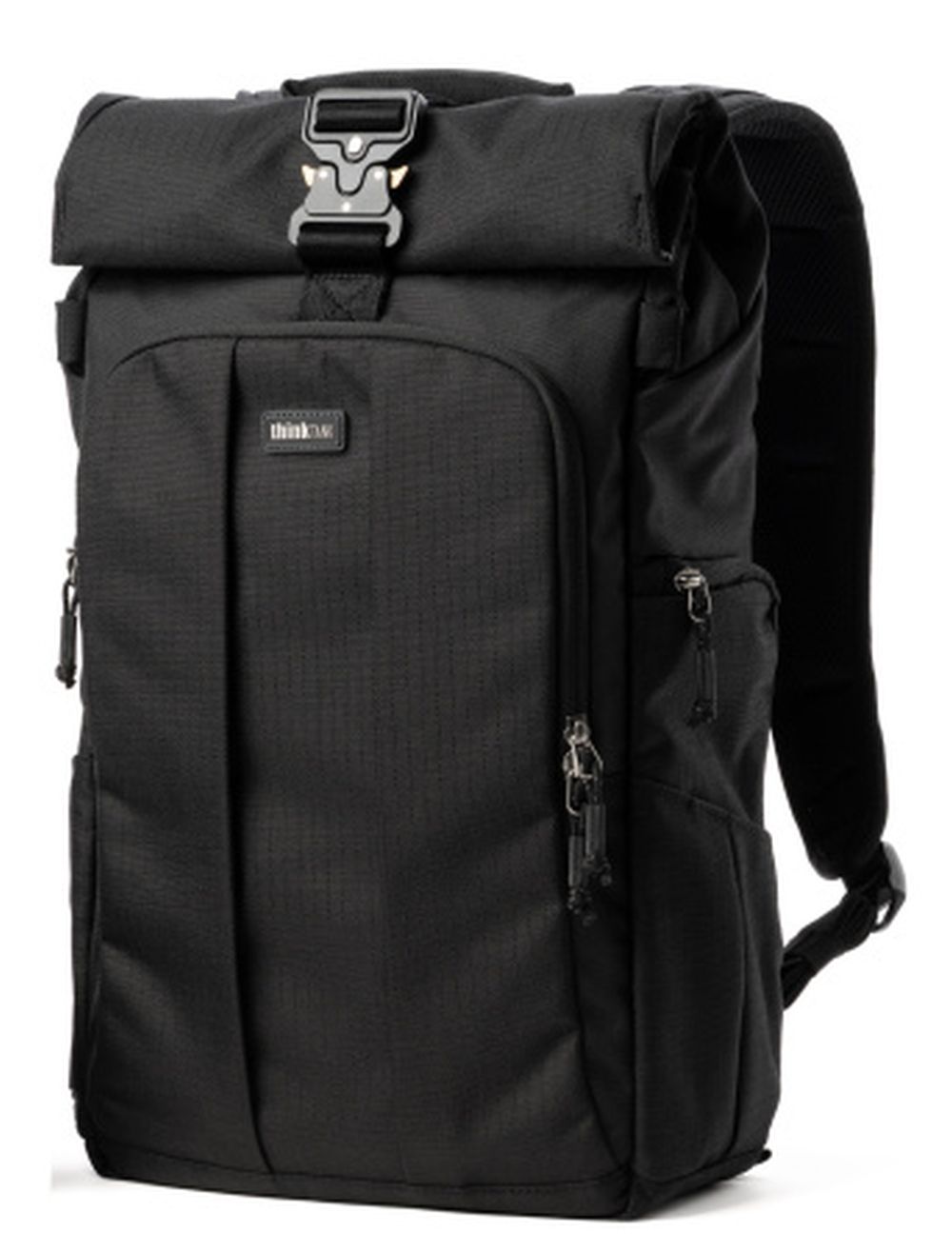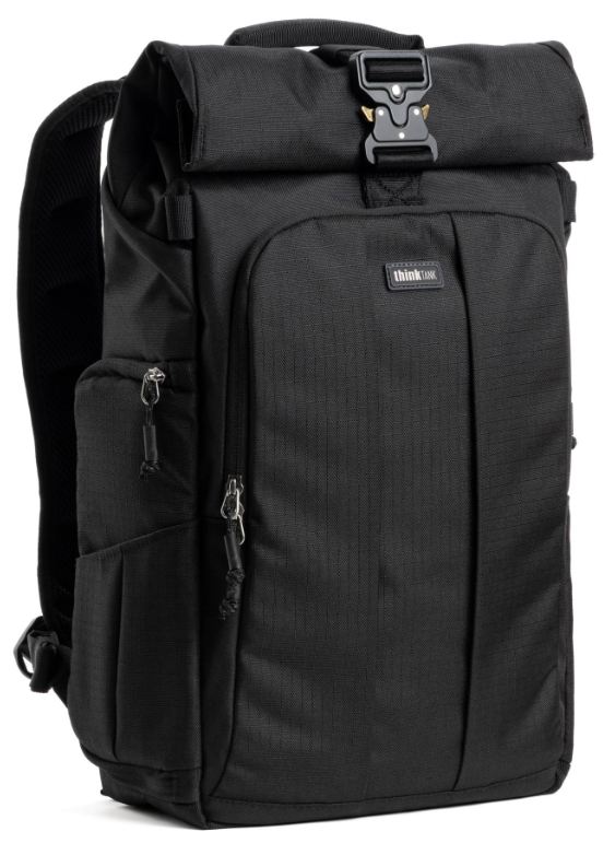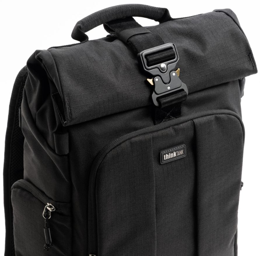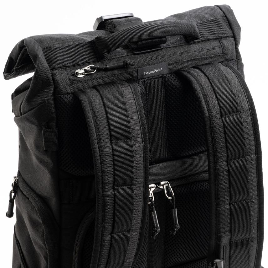 Der FocusPoint Rolltop-Rucksack kombiniert Komfort mit Vielseitigkeit. Durch sein durchdachtes Design kannst du dein Kameraequipment schnell und einfach sowohl von der Rückseite als auch von der Seite herausnehmen. Produktbilder zeigen optionales Zubehör und Anwendungsbeispiele.