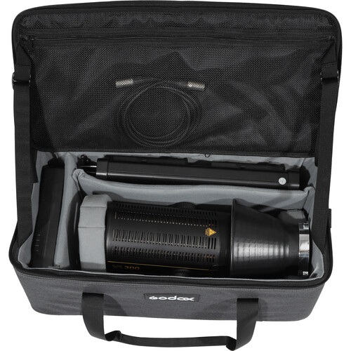 CB-16 - Tragetasche für VL LED Leuchte & Zubehör Die CB-16 Tragetasche wurde speziell für die Aufbewahrung und den Transport der Godox LED Leuchten VL150, VL200 und VL300 konzipiert. Die Tasche ist gepolstert, vielseitig und bietet Platz für die Leuchten und zahlreiches Zubehör. Die Abmessungen betgragen 56 x 29 x 21 cm. Ausstattungsmerkmale: - Kompatibilität: VL LED-Leuchten - Rundum-Reißverschluss mit 2-Wege-Öffnung - Halbstarres Design mit gepolstertem Innenteil - Zwei weiche Tragegriffe mit Polsterung - Verstellbarer Schultergurt - Farbe: Grau - Innenteil: Verstellbare Trennwände (Klettverschluss) - Wasserabweisend - Material: Stoff