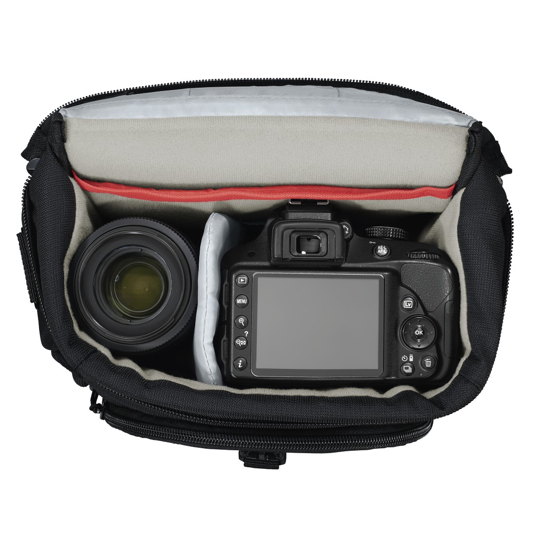 Im gepolsterten Hauptfach mit praktischem Doppelreißverschluss ist Ihre Spiegelreflexkamera mit Objektiv bestens aufgehoben. Wer mehr im Hauptfach verstauen möchte, bringt mit dem variablen Inneneinteiler Ordnung ins Tascheninnenleben. Im flachen Innenfach bringen Sie Smartphone, Ausweis, schmalen Geldbeutel etc. unter – so benötigen Sie für den wichtigen privaten Kleinkram keine extra Tasche. Mit leichtem Gepäck klappt die Motivsuche gleich viel besser!