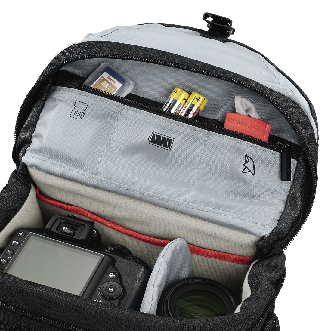 Speicherkarten, Fernauslöser, Filter, Akkus, Batterien, Power Packs und Reinigungstücher finden in den zahlreichen extra Fächern Platz: Vordertasche mit Netzfächern, Reißverschlussfach unter dem Deckel und zwei seitliche Netztaschen.