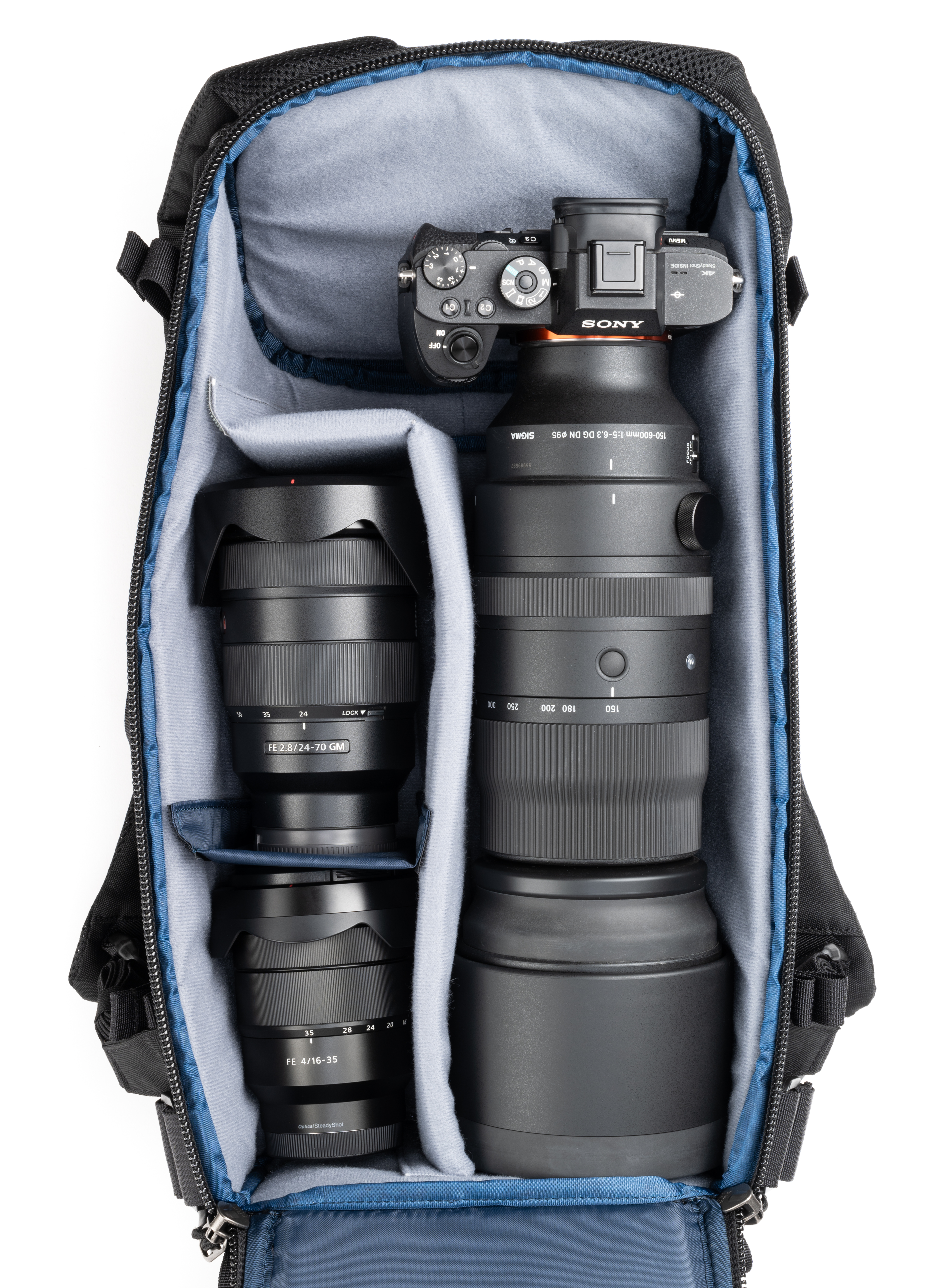 Verstellbare Trennwände bieten Platz für große Teleobjektive, traditionelle Fotoausrüstung oder persönliche Gegenstände.