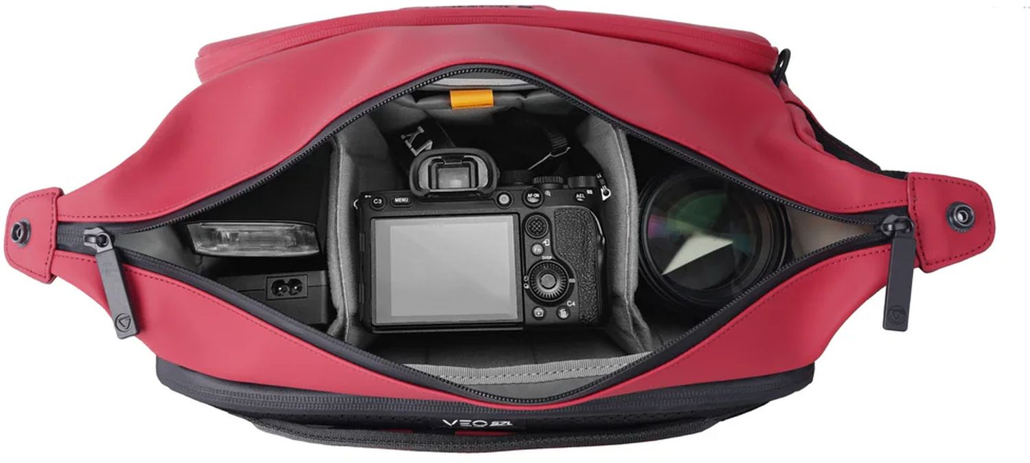 Die VEO LITE Umhängetasche ist eine leistungsstarke Kameratasche, in der Sie Ihre gesamte Fotoausrüstung, darunter spiegellose Kameras, Wechselobjektive, Tablets, mobile Akkus und Kabel, übersichtlich organisieren und verstauen können.