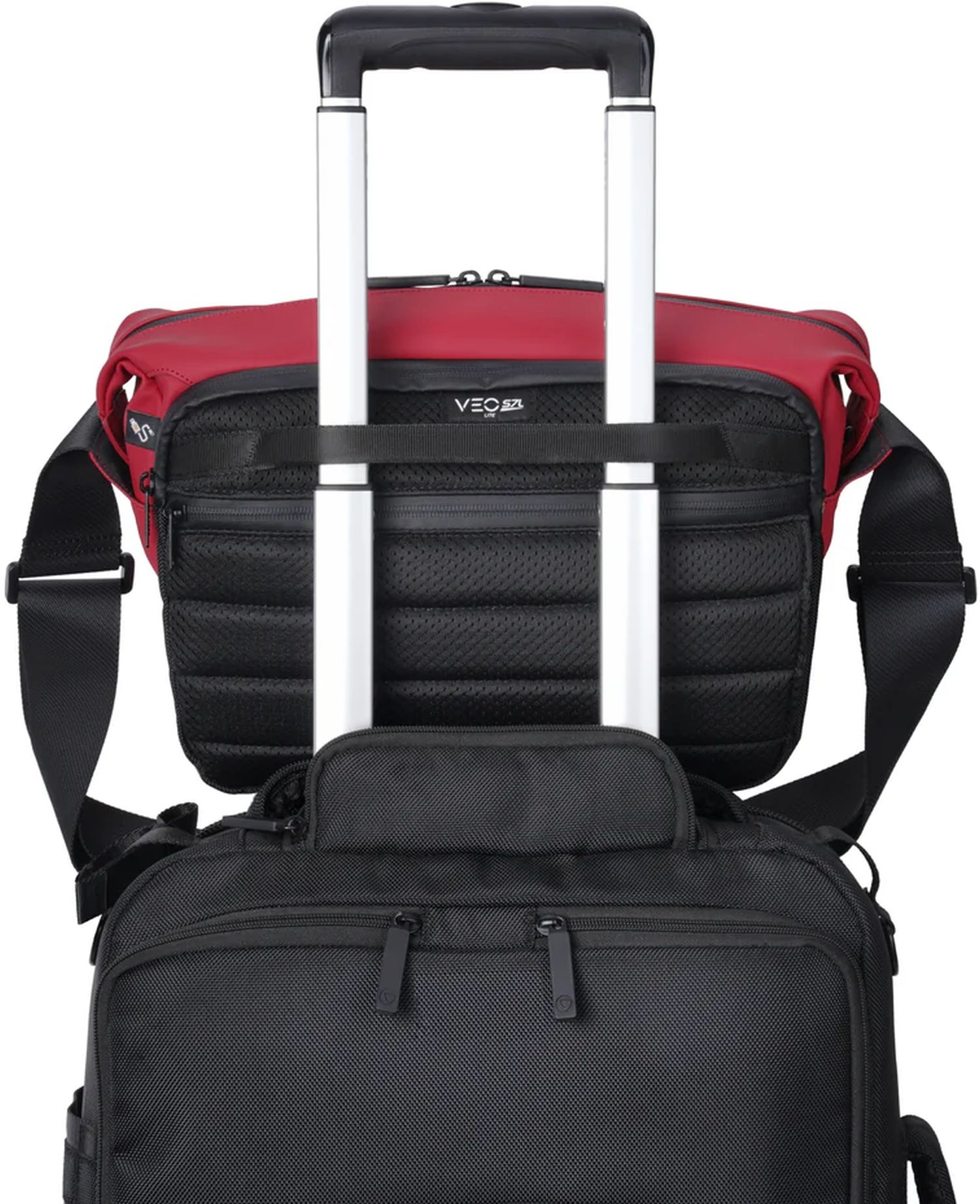 Der VEO LITE S7L verfügt über eine hintere Hülse, die über einen Koffergriff gestülpt und daran befestigt werden kann.