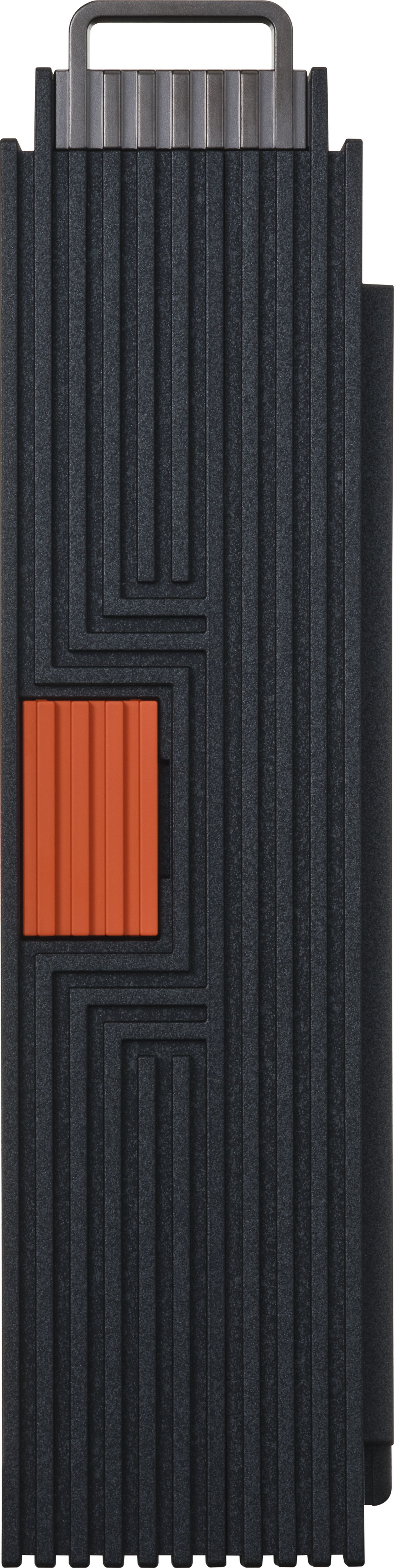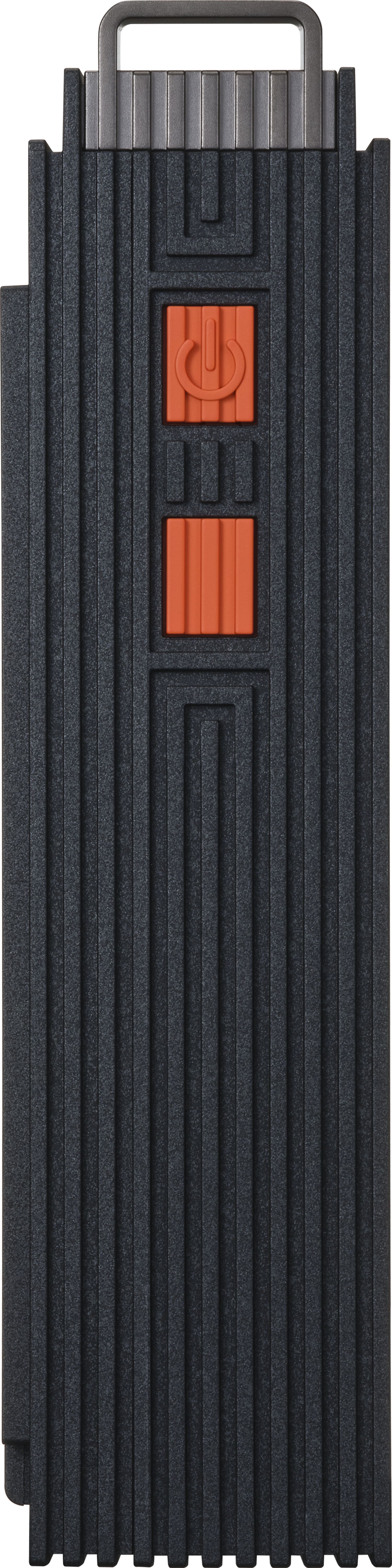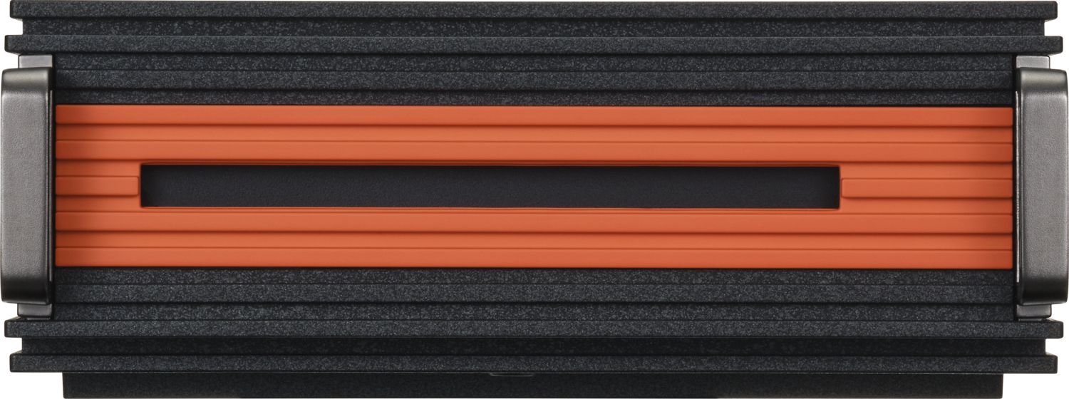 - Stylisches Design: Schwarzes, kompaktes Gehäuse mit orangenen Akzenten – perfekt für unterwegs.