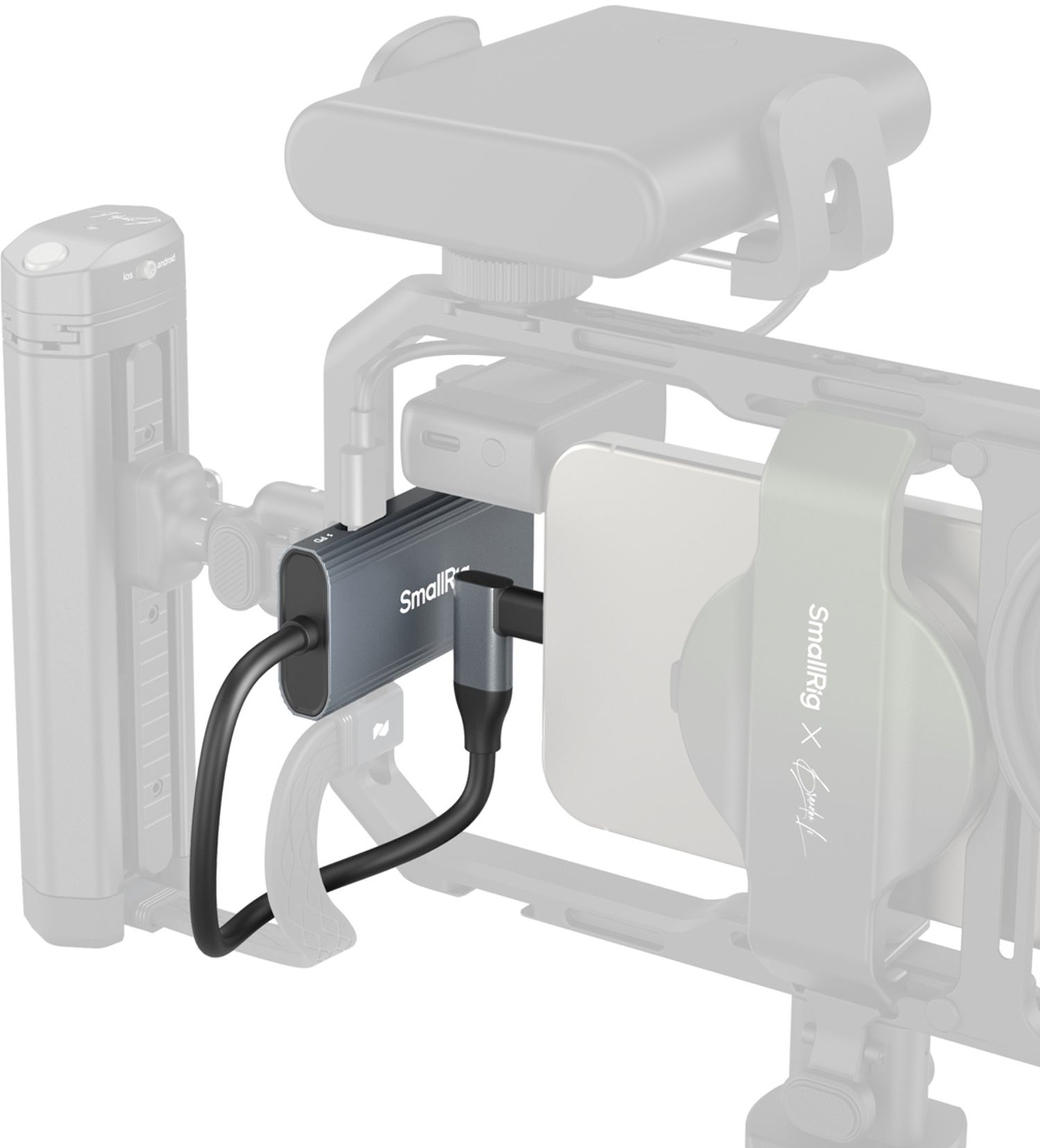 Der kompakte Hub erweitert Ihr Gerät um vier praktische Anschlüsse: USB-C für PD-Ladefunktion, USB-C 3.1 sowie zwei USB-C 2.0 Ports. Dank der integrierten Blitzschuhhalterung lässt sich Zubehör wie Mikrofone oder LED-Leuchten schnell und einfach montieren – ideal für unterwegs und flexible Setups. Produktbilder zeigen optionales Zubehör und Anwendungsbeispiele.