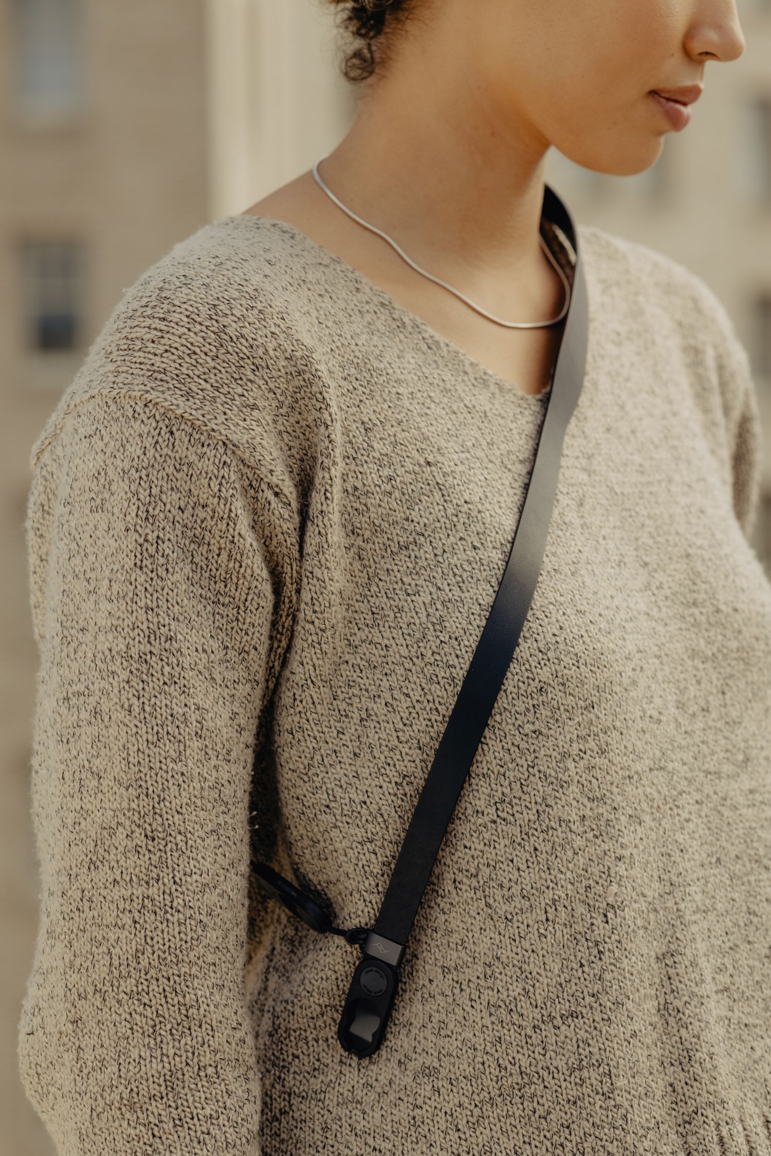 Du hast eine besonders leichte Point-and-Shoot-Kamera und möchtest nur einen der Aufhängepunkte nutzen? Dann kannst du einen der Anchor Links durch die dezent am Seil angebrachte Öse ziehen und festmachen. So machen alle Gurte auch in dieser Tragevariante eine perfekte Figur. Und wer schon die anderen Peak Design-Gurte genutzt hat, wird die Anchor-Plate wiedererkennen. Die kleine Alu-Kameraplatte mit ultra flachem Profil trägt kaum auf und liefert einen stabilen Haltepunkt an der Bodenplatte. So hängt die Kamera mit dem Objektiv nach unten am Körper - eine besonders agile Position, die viele bevorzugen.