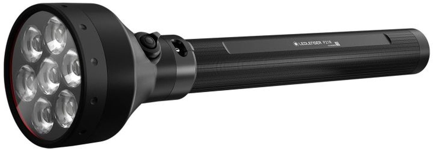 Die P21R von Ledlenser ist der leistungsstarke Suchscheinwerfer und zugleich die größte Taschenlampe der Marke, mit brillanter Lichtqualität, bis zu 12.000 Lumen im Boost-Modus und Fokussierfunktion (Advanced Focus System). Produktbilder zeigen optionales Zubehör und Anwendungsbeispiele.